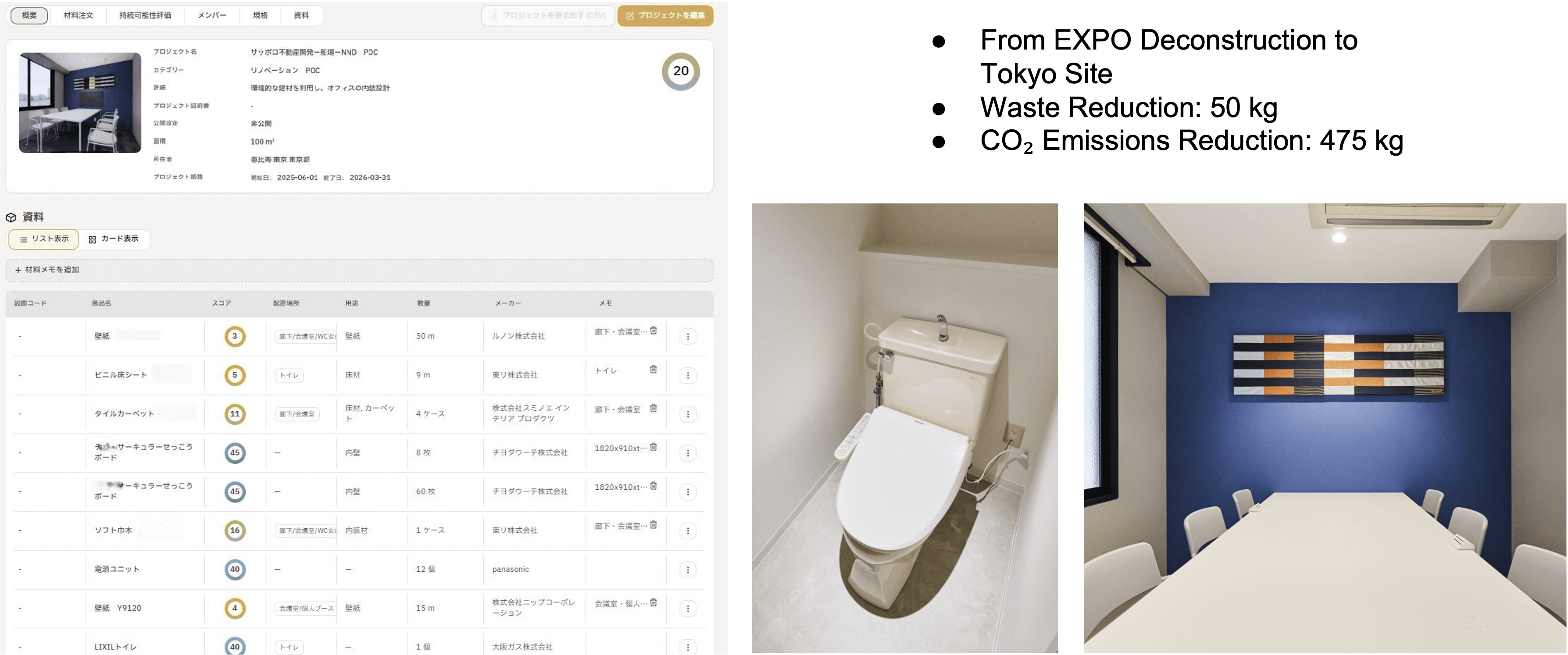 Matinno executed the reuse of materials used for approximately six months at Expo 2025 Osaka, Kansai, Japan for an office renovation project in Ebisu, Tokyo. Despite a demanding schedule where demolition and construction occurred consecutively, the platform ensured quality and timely delivery through pre-matching. The project achieved a CO₂ reduction of approximately 475kg and a significant decrease in construction waste, proving the viability of circular architecture in real-world scenarios.